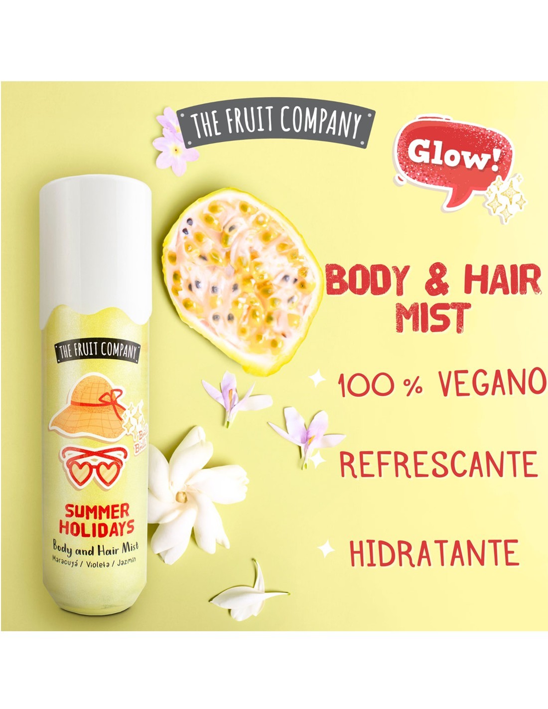The Fruit Company Mist Cabello y Cuerpo Summer Holidays es el toque brillante que necesitas para lucir radiante este verano. Su fórmula con brilli brilli aporta un sutil resplandor, mientras perfuma cuerpo y cabello con un delicioso aroma a maracuyá, violeta y jazmín.