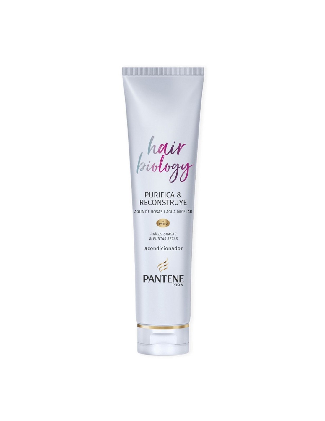 Acondicionador Pantene Hair Biology Purifica & Repara con antioxidantes y micelar, ideal para cabello graso o con puntas dañadas.