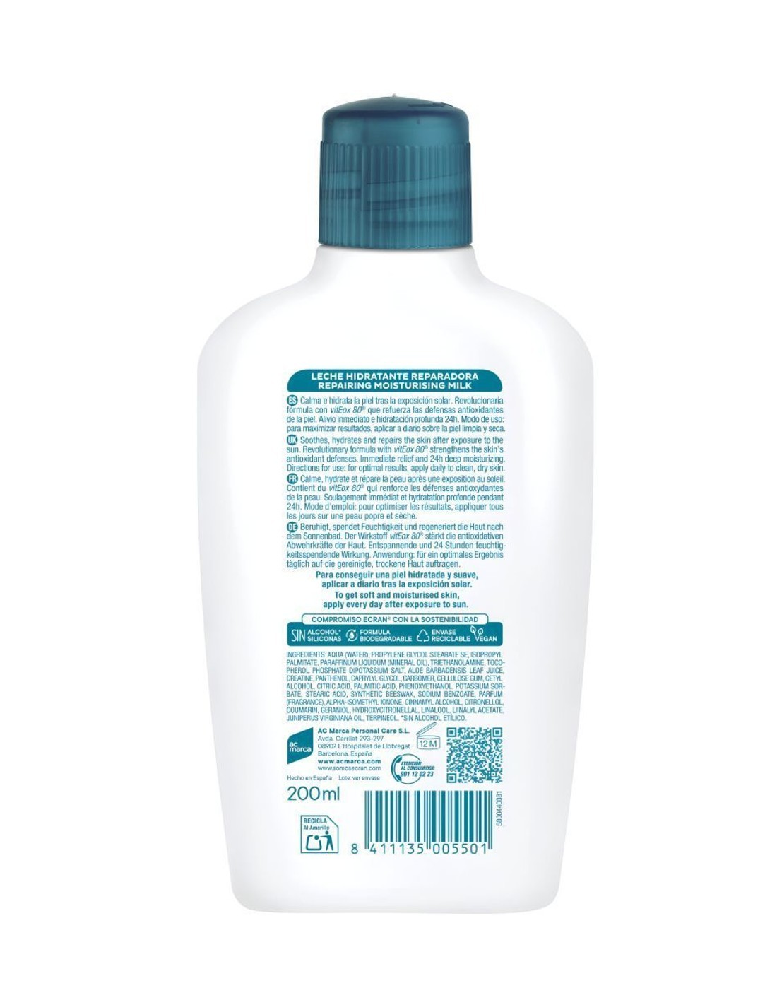 La Leche Reparadora Hidratante After Sun de Ecran en formato de 200 ml es el aliado perfecto para cuidar tu piel después de la exposición solar. Gracias a su fórmula con activos calmantes y antioxidantes, ayuda a reparar el daño solar, aliviar la tirantez y prevenir la descamación.