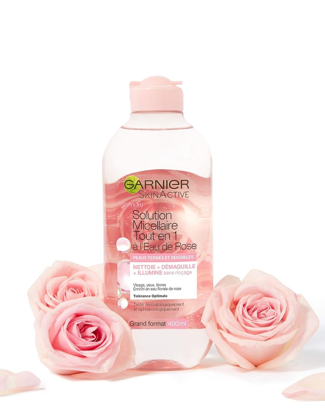 Garnier Agua Micelar con Agua de Rosas 400 ml limpia, desmaquilla y tonifica en un solo gesto. Aporta frescor y suavidad a todo tipo de pieles.