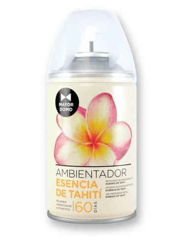 El Recambio para Ambientador Automático Mayordomo Esencia de Tahití es la forma más práctica de llevar el ambiente de una isla tropical a tu hogar. Su fragancia a Tahití, con notas exóticas y florales, llena la estancia de forma continua, creando una atmósfera de frescura y calidez. Este aerosol, compatible con la mayoría de los difusores automáticos del mercado, garantiza una pulverización constante para que el aroma perdure durante semanas. También puede usarse manualmente para un toque instantáneo de frescura.