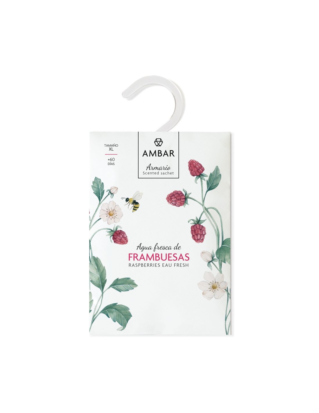 Ambientador Armario Aguas Frescas Frambuesas Ambar Perfums de tamaño XL con el que perfumar tus armarios y cajones con una fragancia frutal, dulce y ligeramente floral a Frambuesas durante más de 60 días.