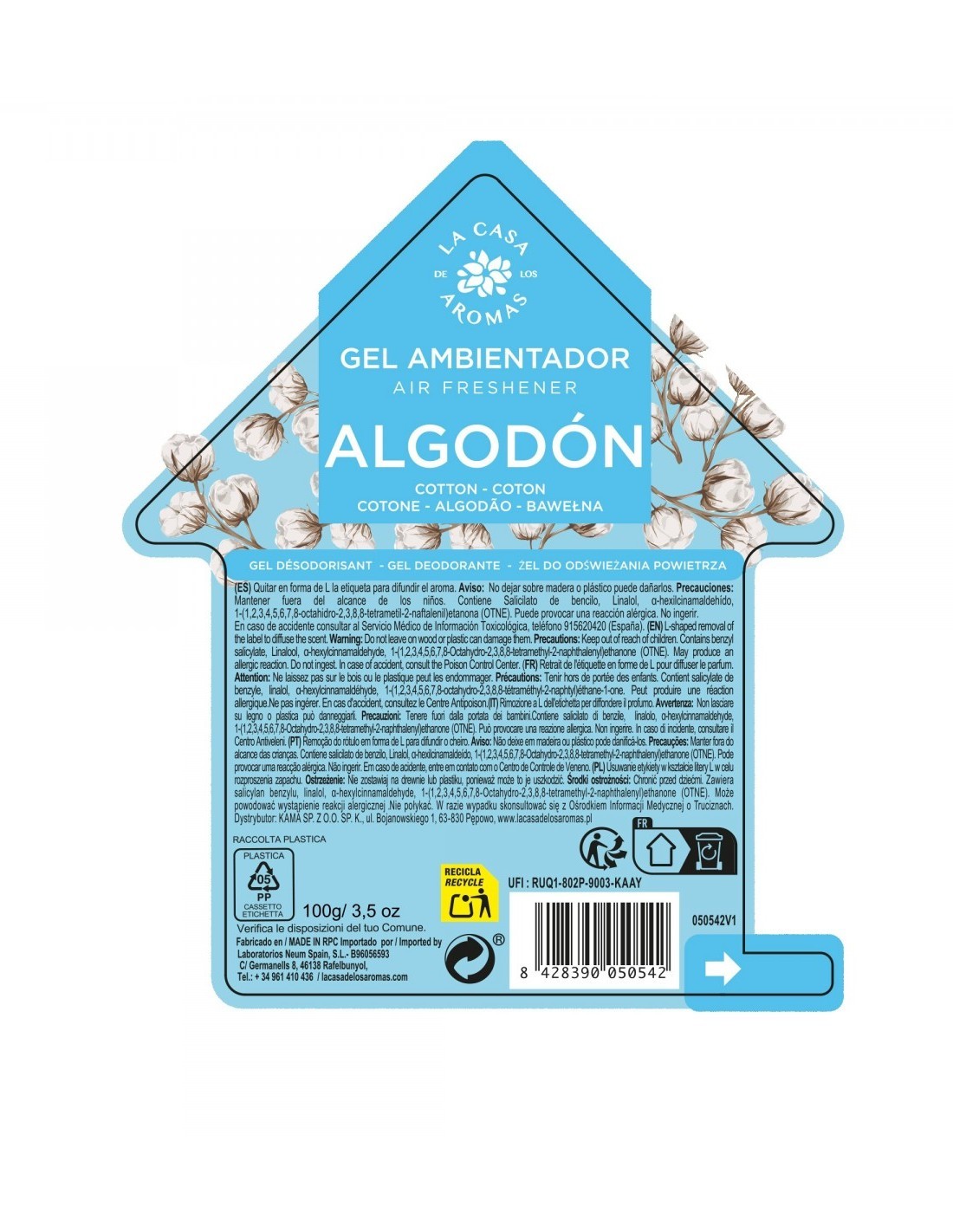 Ambientador en gel con fragancia a algodón. Formato práctico para baños y armarios. Neutraliza olores y aporta frescor durante semanas.