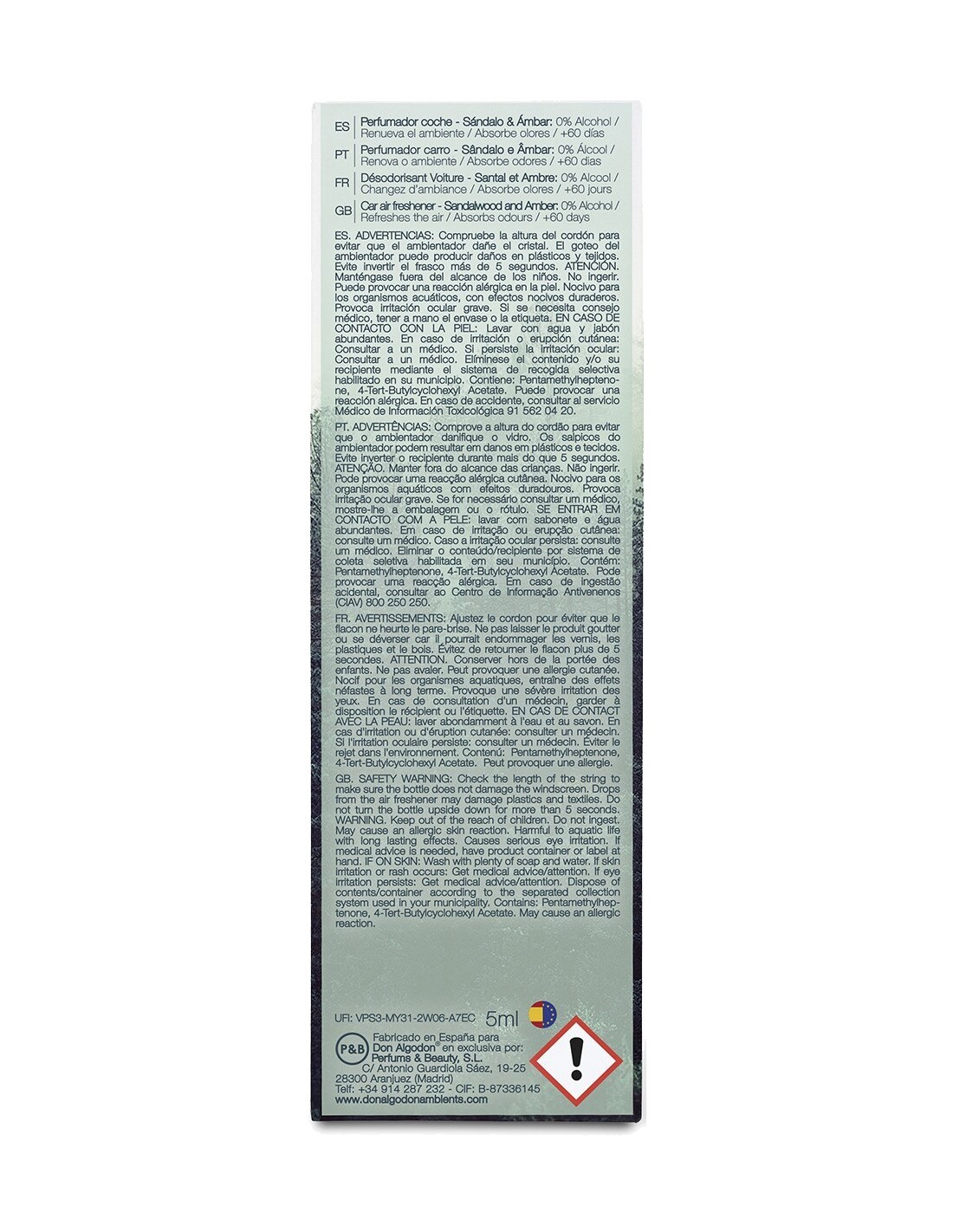 Ambientador de Coche Don Algodón Hombre Sándalo & Ámbar transforma cada viaje en una experiencia sensorial única. Su innovadora fórmula absorbe los malos olores y llena el coche con una fragancia exquisita, durando más de 60 días.