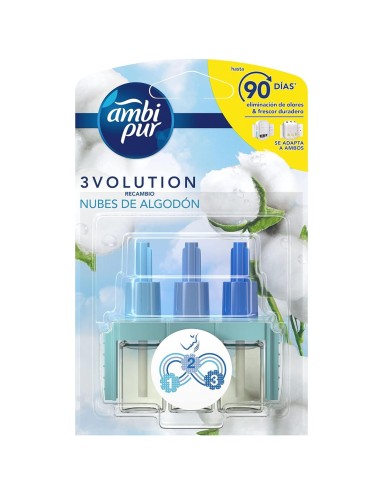 El recambio Ambi Pur 3Volution Nubes de Algodón te ayuda a mantener tu hogar con una fragancia fresca y envolvente durante semanas. Su tecnología combina tres aromas complementarios que se alternan automáticamente cada 45 minutos, evitando que te acostumbres al olor y logrando una sensación constante de limpieza.