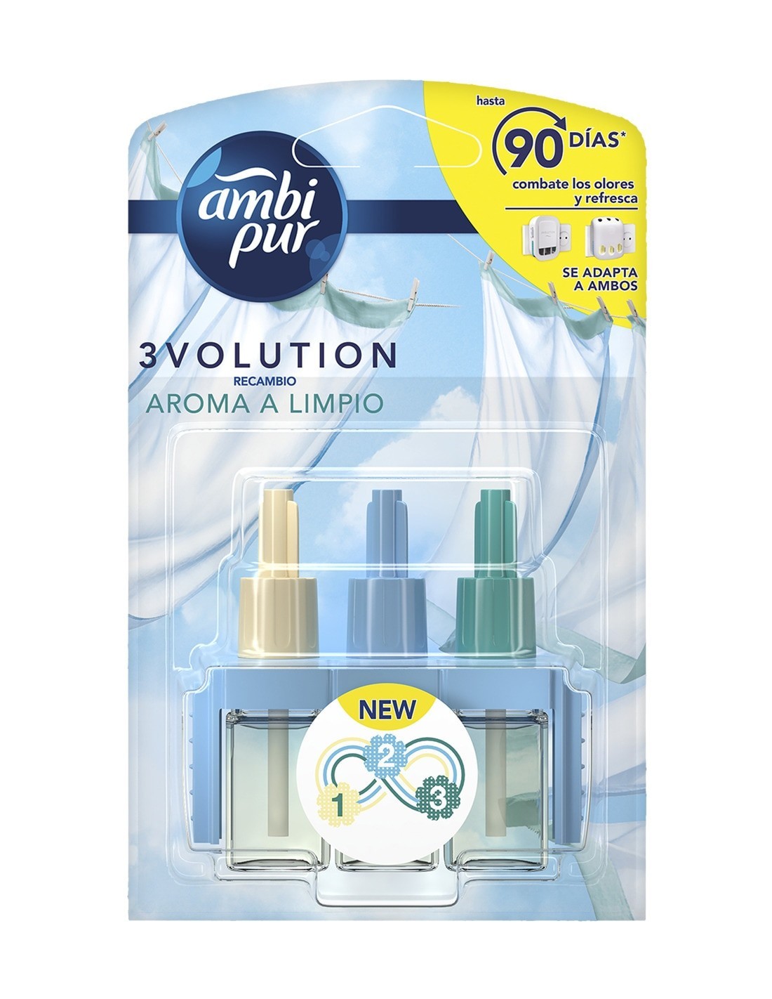 Ambi Pur 3Volution Aroma a Limpio transforma el ambiente de tu hogar con una fragancia continua y fresca que recuerda a la limpieza recién hecha. Su tecnología exclusiva alterna automáticamente tres aromas complementarios cada 45 minutos, evitando que tu olfato se acostumbre y manteniendo una sensación de frescor constante.