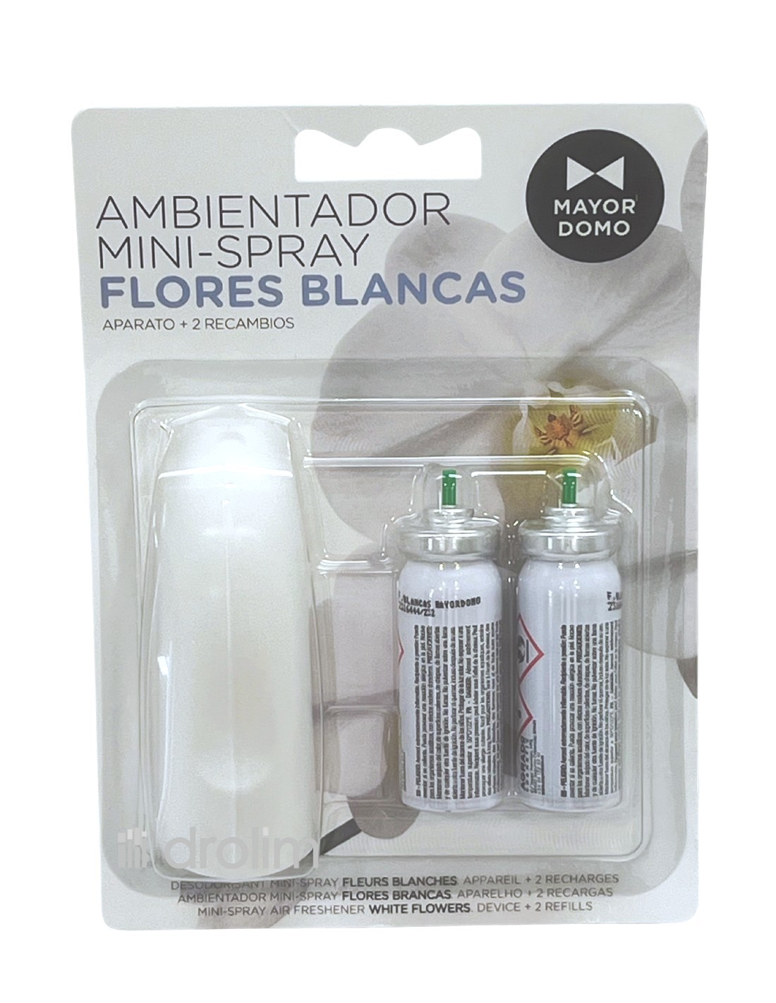 Mayordomo Ambientador Mini Spray 1 Aparato + 2 Recambios Flores Blancas es ideal para mantener tu hogar u oficina con una fragancia fresca y agradable. Su práctico diseño incluye un aparato y dos recambios de flor blanca que proporcionan un aroma duradero, manteniendo el ambiente siempre limpio y perfumado. Su formato compacto lo hace perfecto para usar en cualquier lugar, desde habitaciones hasta el coche o espacios pequeños. Además, su acción continua garantiza que el aroma permanezca durante más tiempo, creando un ambiente relajante y acogedor.