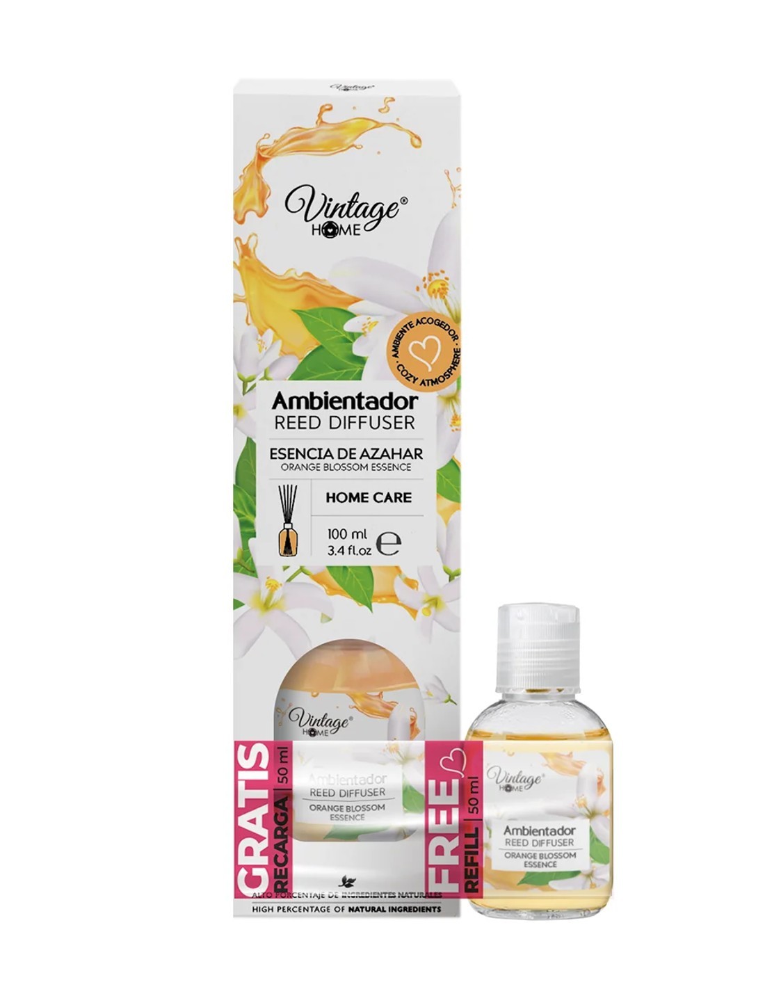 El Ambientador Mikado Esencia de Azahar llena tu hogar con un aroma floral y cítrico que recuerda a la flor del naranjo en primavera. Este set incluye una botella de 100 ml con varillas de ratán y un práctico recambio de 50 ml, para que disfrutes de una fragancia fresca y duradera. Su sistema de difusión gradual perfuma el ambiente de manera constante, creando una atmósfera relajante y llena de vitalidad.