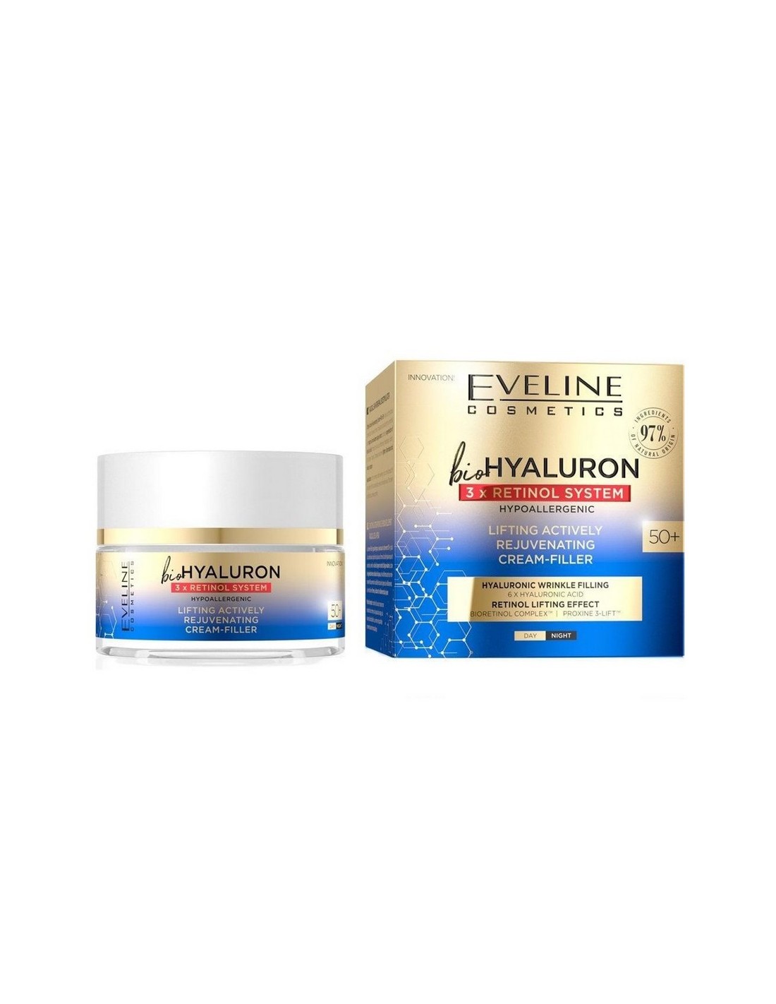 Crema lifting rejuvenecedora Eveline 3xRetinol para pieles 50+. Acción día/noche para reducir arrugas, reafirmar y rejuvenecer. 50 ml.