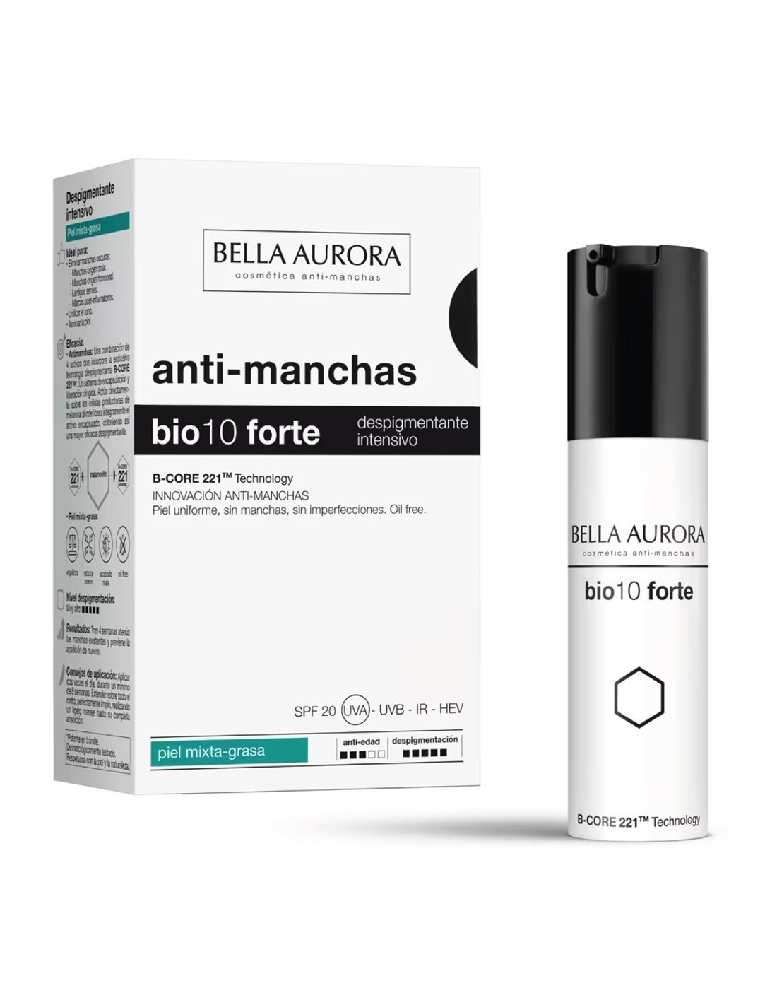 El sérum Bio10 Forte L-tigo de Bella Aurora está diseñado para tratar las manchas oscuras y las imperfecciones en pieles mixtas a grasas. Su fórmula de avanzada tecnología B-Core 221 actúa directamente sobre las células productoras de melanina, reduciendo las manchas de forma visible. Con una textura ligera, oil-free y de rápida absorción, este sérum matifica el rostro y no obstruye los poros, ayudando a mejorar la textura de la piel. Además, previene la aparición de futuras manchas, unificando el tono y aportando luminosidad al rostro.