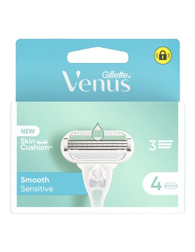 Recambios Gillette Venus Smooth Sensitive con 4 hojas, ideales para pieles sensibles. Suavidad y precisión en cada pasada.