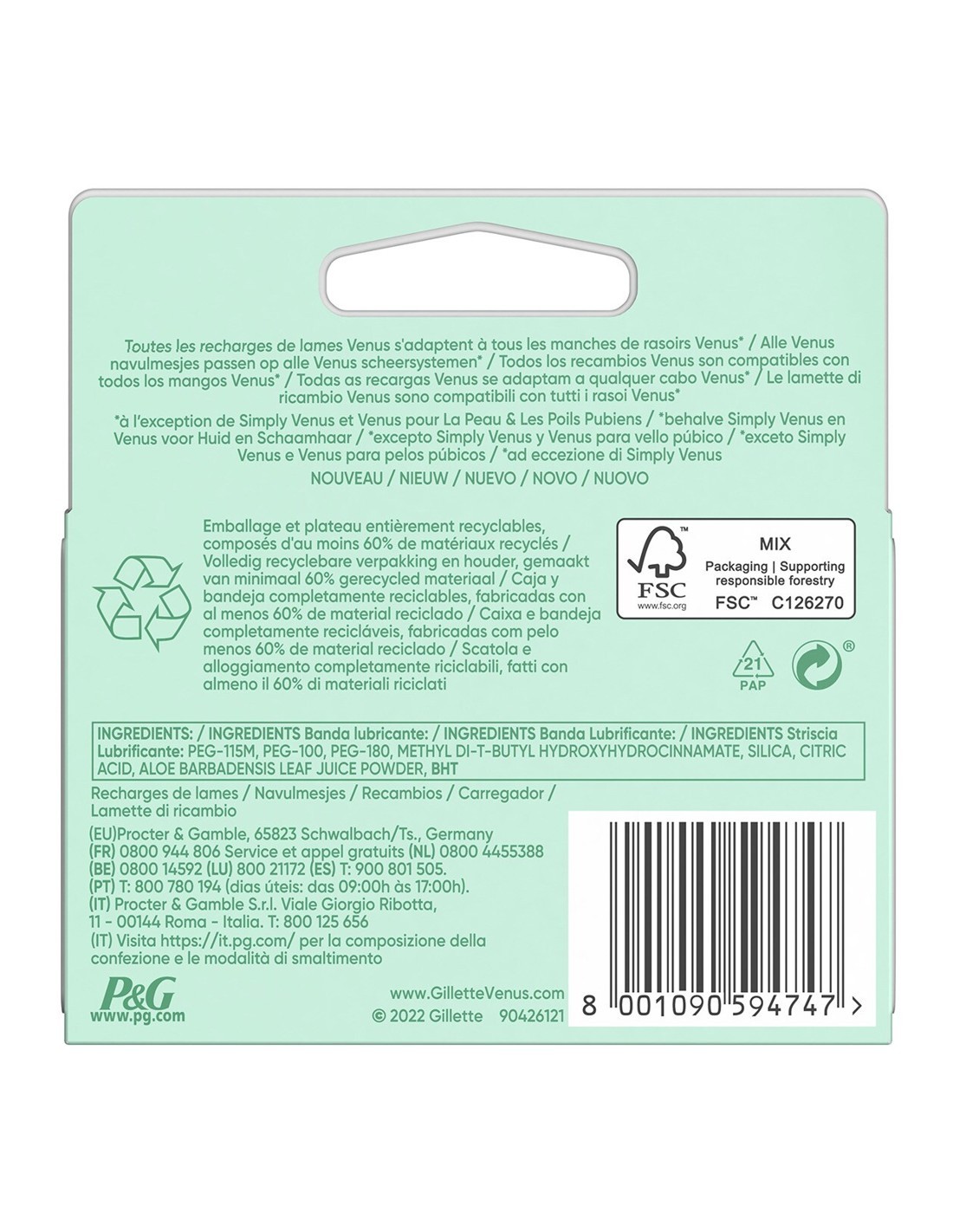 Este pack contiene 4 unidades de recambio, compatibles con los mangos Gillette Venus (excepto Simply Venus y Venus for Pubic Hair & Skin). Ideal para quienes buscan eficacia, suavidad y cuidado en cada afeitado.