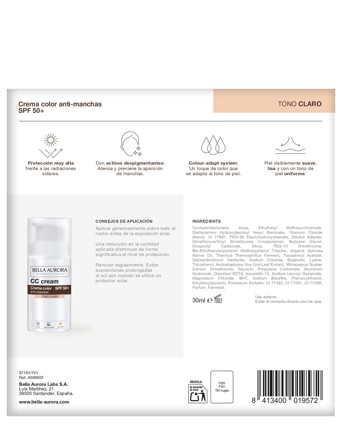 Bella Aurora CC Cream SPF50+ tono claro es una crema con color que combina tratamiento, maquillaje ligero y protección solar elevada en un solo producto. Su tono claro se adapta perfectamente a pieles claras, unificando el tono y disimulando imperfecciones con un acabado natural y sin brillos.