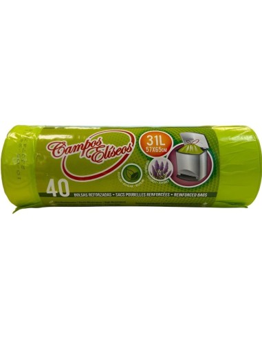 Bolsas de basura Campos Elíseos 57x65 cm, color verde, con cierre fácil. Capacidad de 31L y pack de 40 unidades. Resistencia y comodidad en el uso diario.