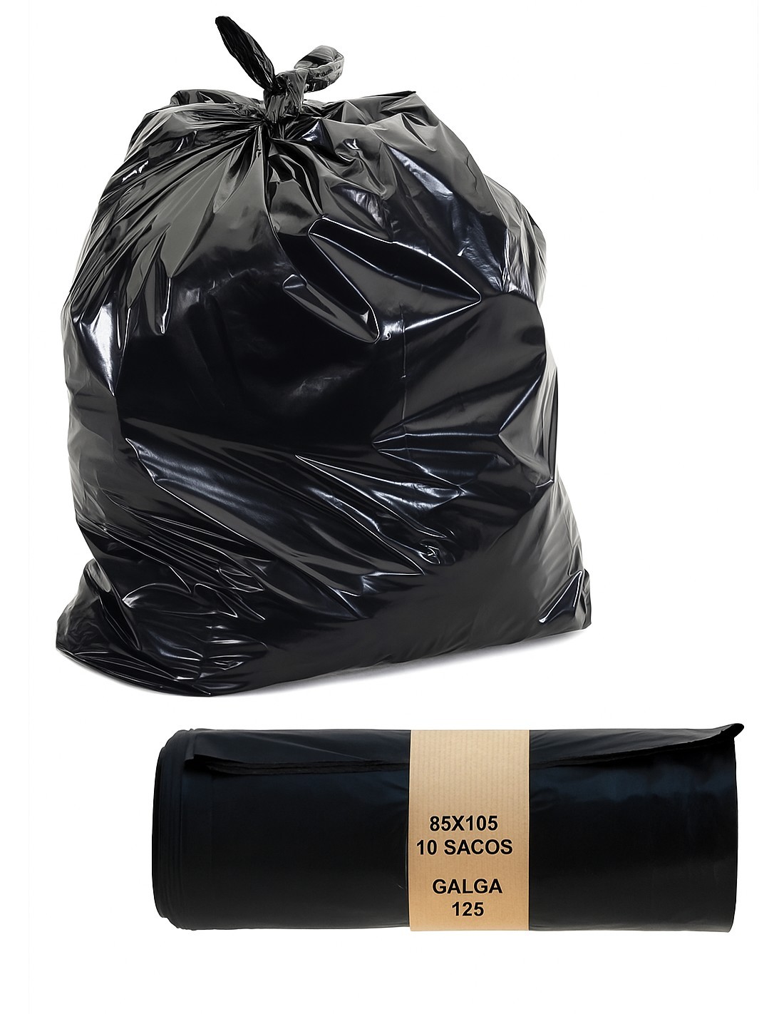 Saco de basura negro 85x105 cm, 100L, 10 unidades. Resistente G/125, ideal para residuos voluminosos y pesados.
