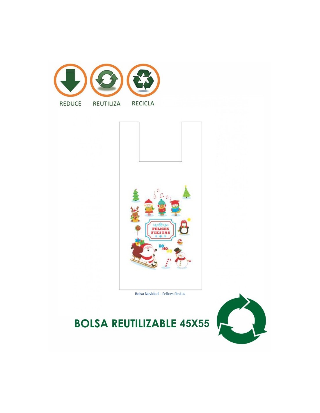 Bolsas de camiseta con impresión de motivos navideños a todo color en CUATRICROMIA. La bolsa Navidad Felices fiestas, fabricada con espesor de 50 micras (G-200) y compuesta por más de un 70% de plástico reciclado, con certificación AENOR 53930 que permite su entrega gratuita en los puntos de venta según el Real Decreto 293/2018.