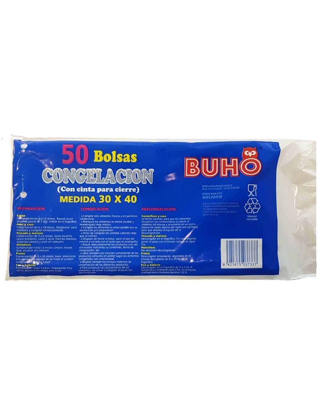 Bolsas de congelación de la marca Búho, tamaño 30x40 cm, transparentes y resistentes. Pack de 50 unidades para conservar alimentos de forma segura y práctica.