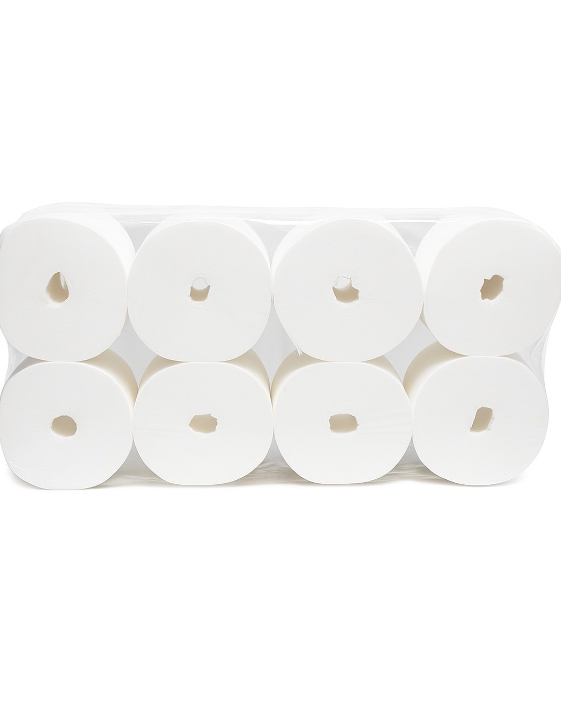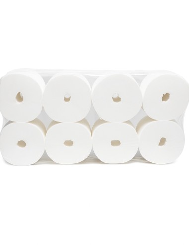 Papel higiénico industrial de extracción central, 100% celulosa virgen, doble hoja. Pack de 8 rollos de 197 m cada uno.