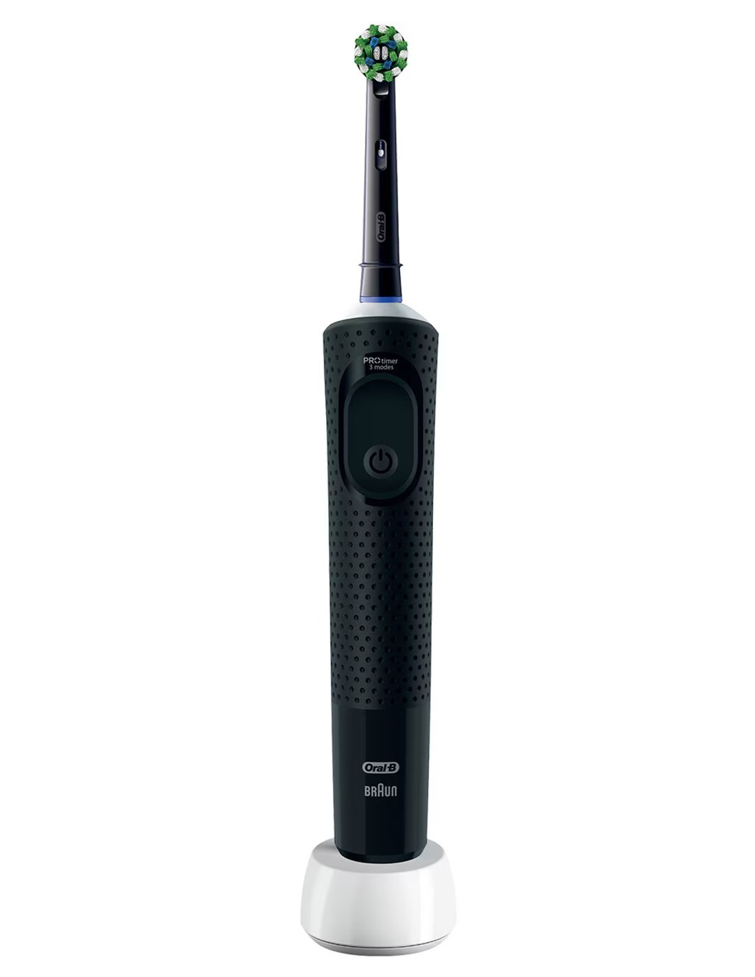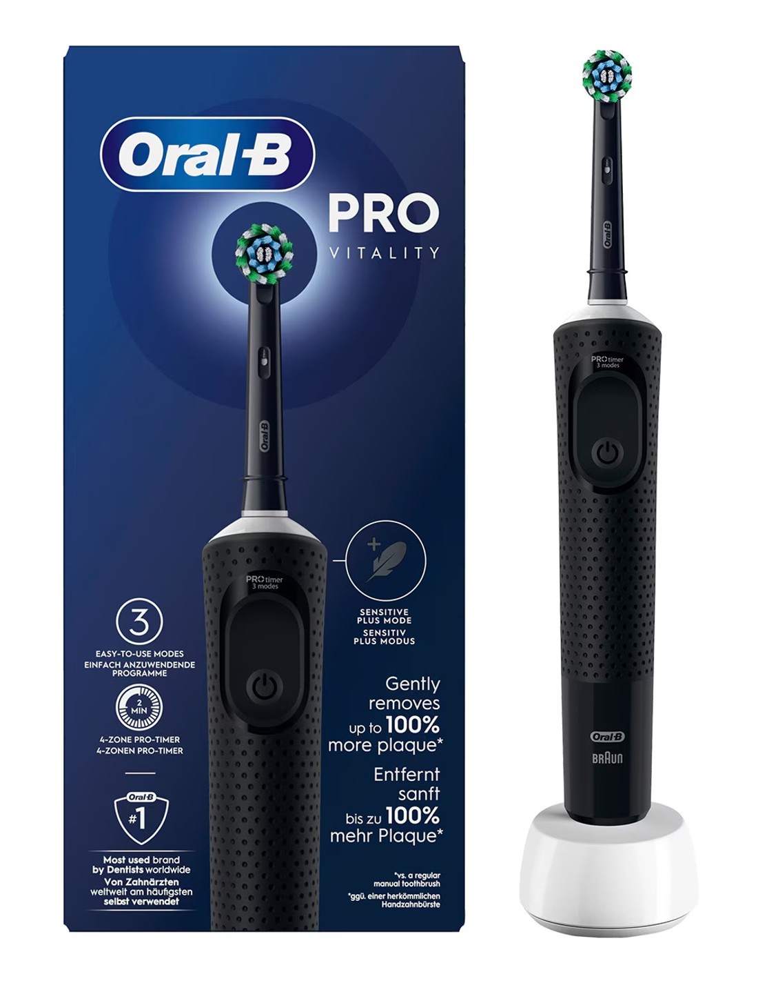 El cepillo eléctrico Oral-B Vitality Pro en color negro proporciona una limpieza superior frente a los cepillos manuales gracias a su tecnología de acción 2D, que oscila y rota para eliminar eficazmente la placa.