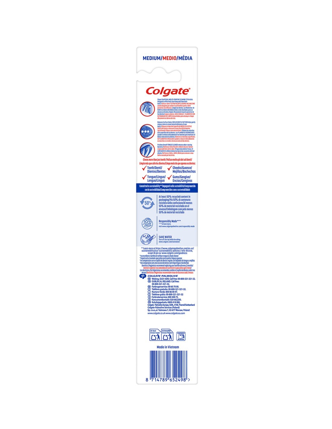 El Cepillo Dental Colgate Triple Action de dureza media ha sido diseñado para proporcionar una limpieza bucal completa y efectiva. Este cepillo se enfoca en tres áreas clave para una higiene superior:
