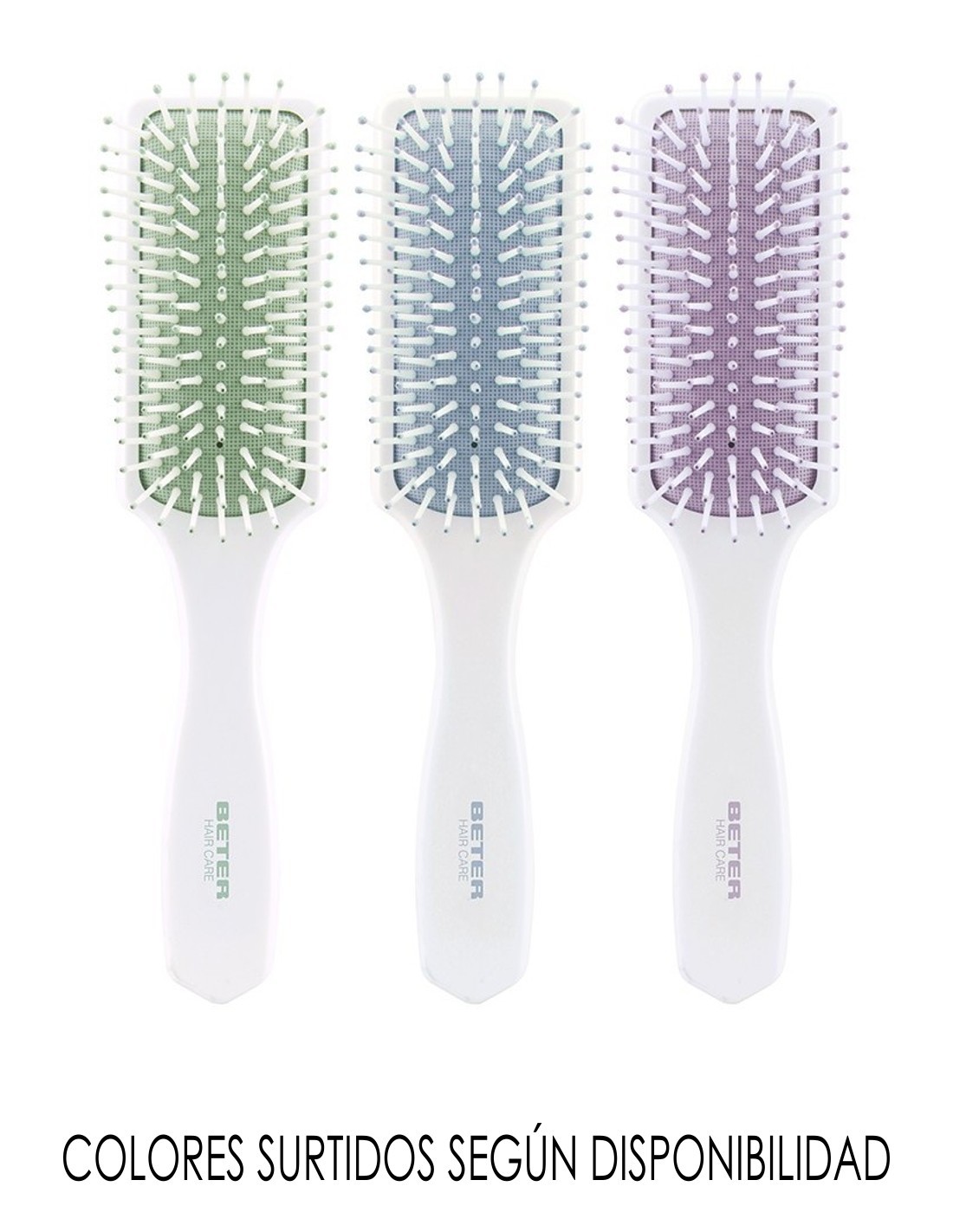 Cepillo neumático rectangular con púas de nylon 22,5 cm. Desenreda sin tirones, ideal para todo tipo de cabello. Suave con el cuero cabelludo.
