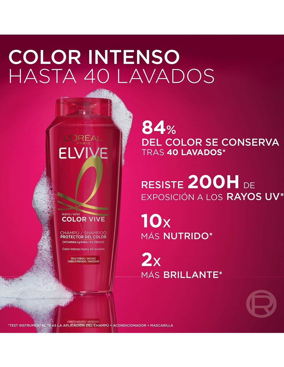 Elvive Champú Color Vive 400 ml está formulado para cuidar y prolongar la belleza del cabello teñido o con mechas. Su fórmula nutritiva ayuda a proteger la fibra capilar, manteniendo la intensidad del color durante más tiempo y aportando un brillo radiante desde la primera aplicación.