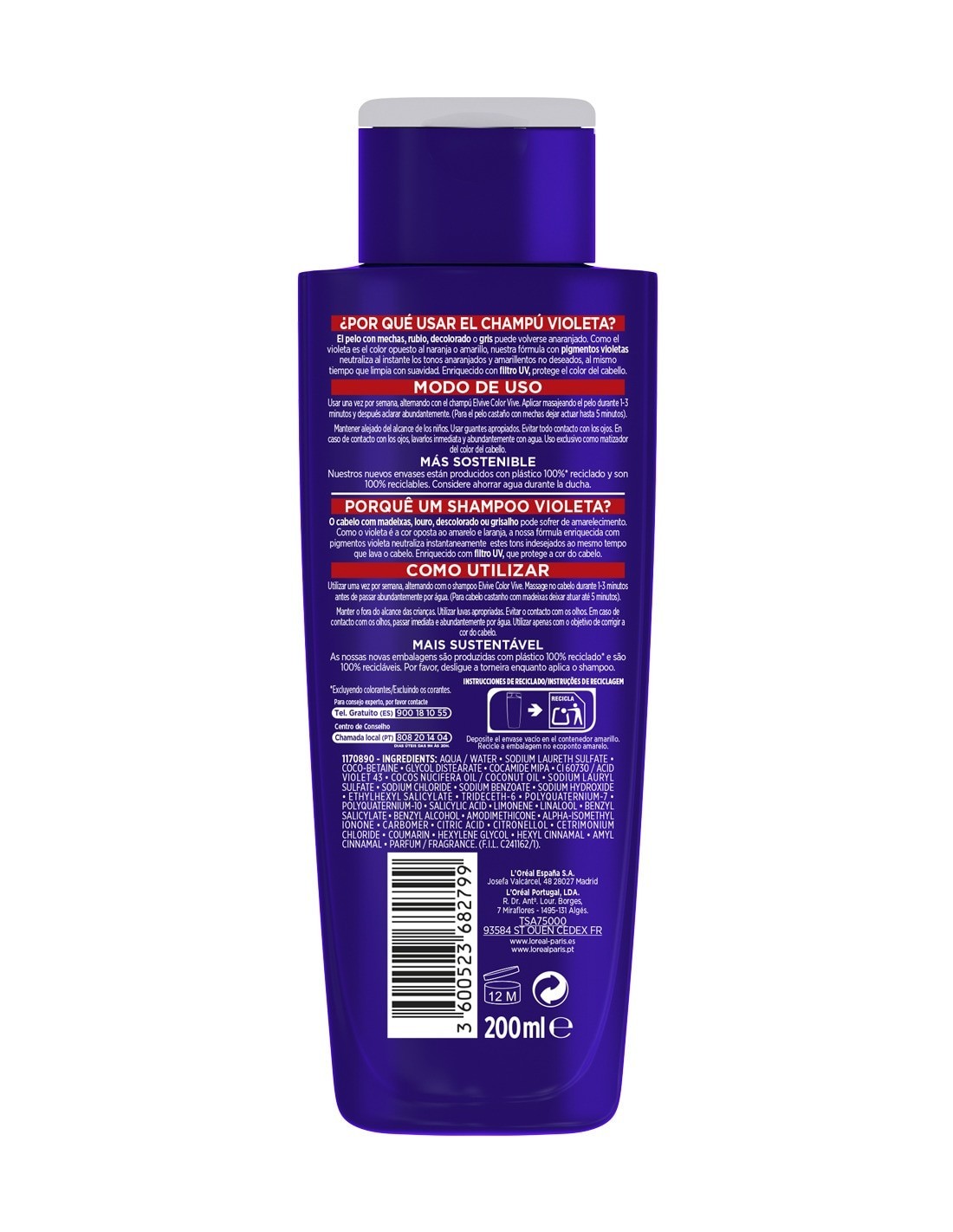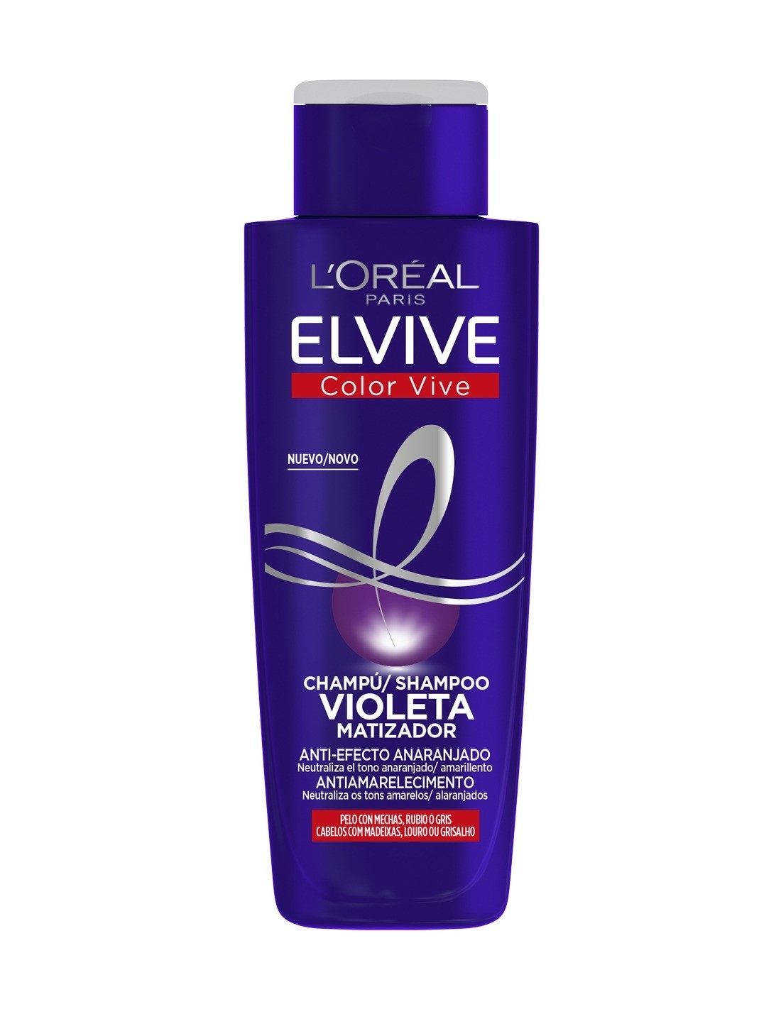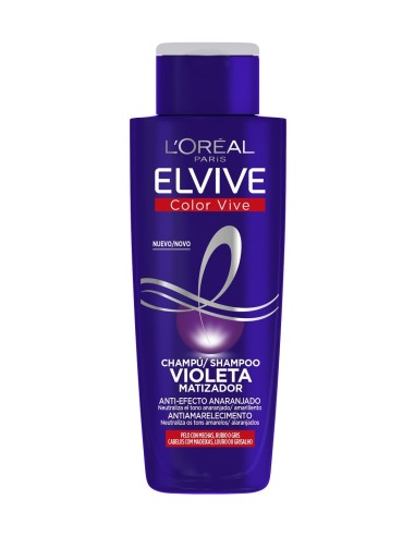Champú violeta Elvive que neutraliza tonos anaranjados en cabellos rubios, decolorados o con mechas. Matiza y aporta brillo desde el primer uso.