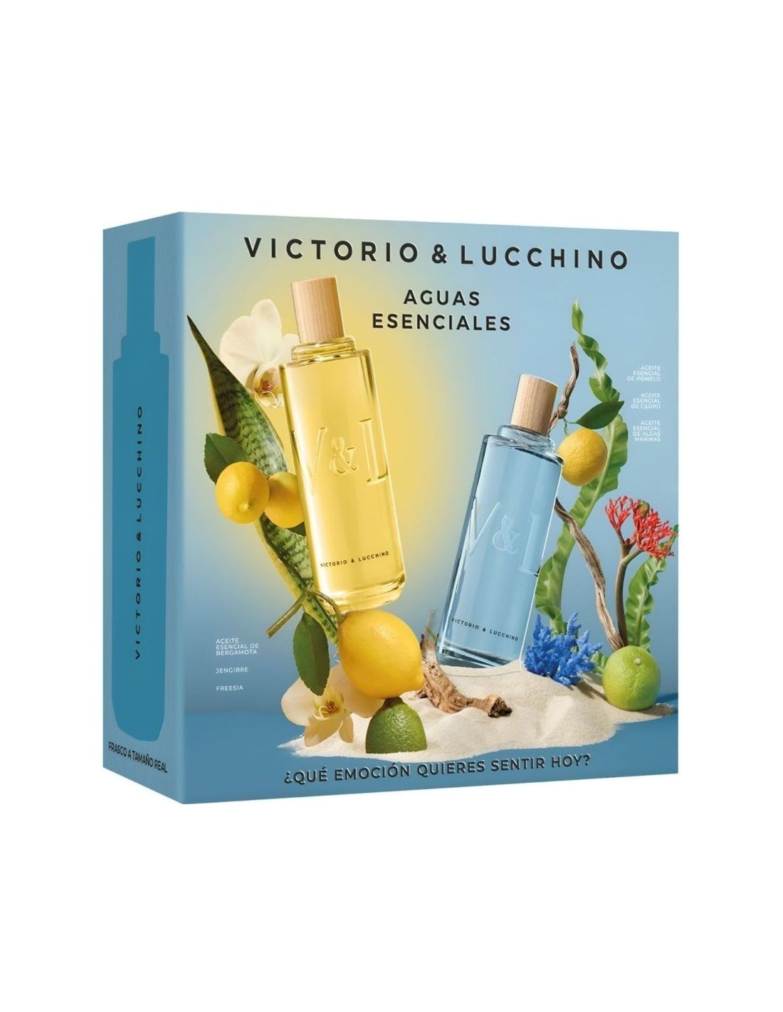 El Set Aguas Esenciales de Victorio & Lucchino es la propuesta perfecta para disfrutar de dos fragancias refrescantes y llenas de energía. Este dúo en formato grande ($2 \times 250 \text{ ml}$) te permite elegir el aroma que mejor se adapta a tu estado de ánimo diario.