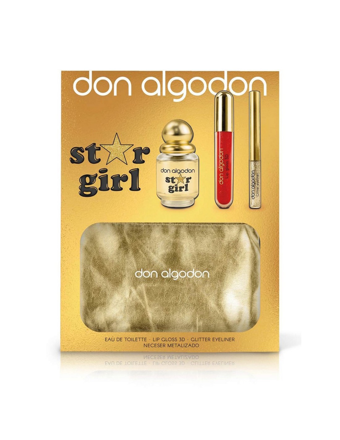 El set Star Girl de Don Algodón es una combinación irresistible de frescura y glamour. Su colonia floral con notas de mandarina y jazmín te envolverá en una fragancia adictiva. El lip gloss rojo intenso y el eyeliner dorado con glitter aportarán un toque de sofisticación a cualquier look. Y el neceser metalizado será el complemento perfecto para llevar contigo todos tus esenciales.