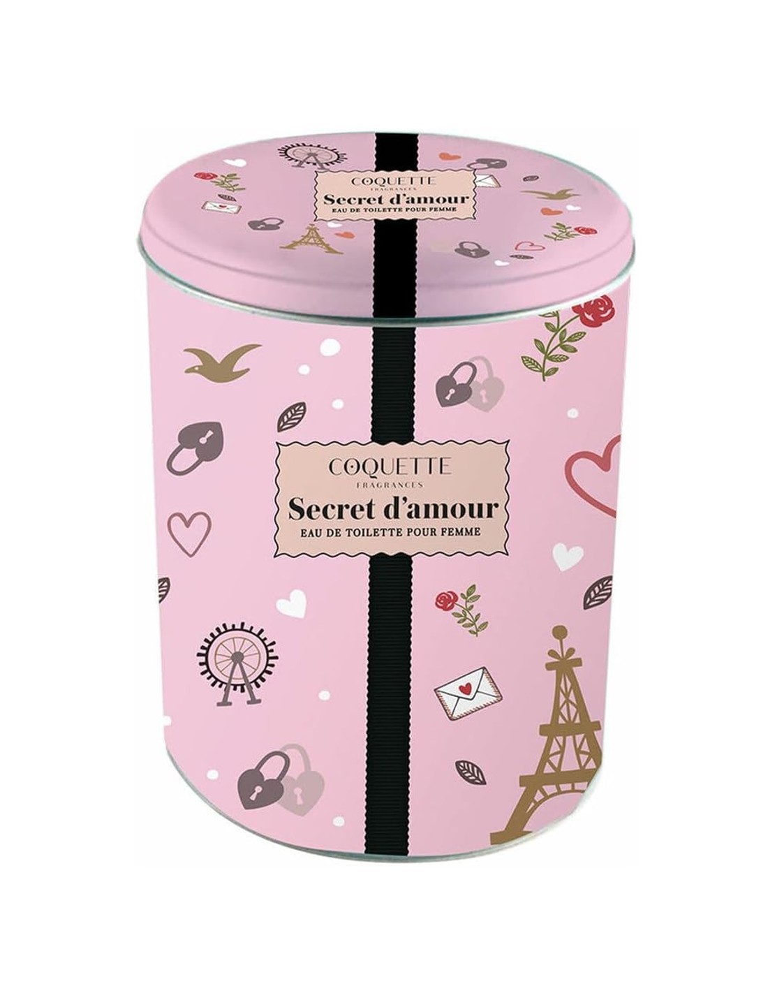 Estuche de lata con Eau de Toilette Coquette Secret D'amour para mujer. Fragancia floral, suave y romántica en spray de 100 ml.
