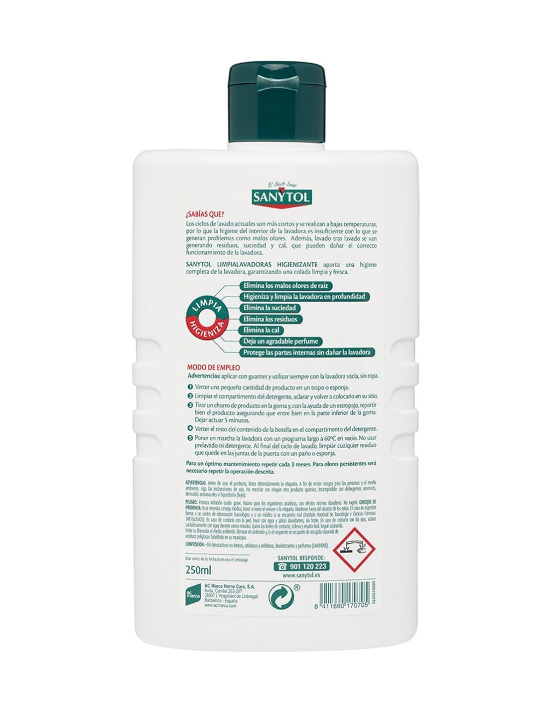 Especificaciones de uso para Sanytol Limpia Lavadoras Higienizante 250 ml: