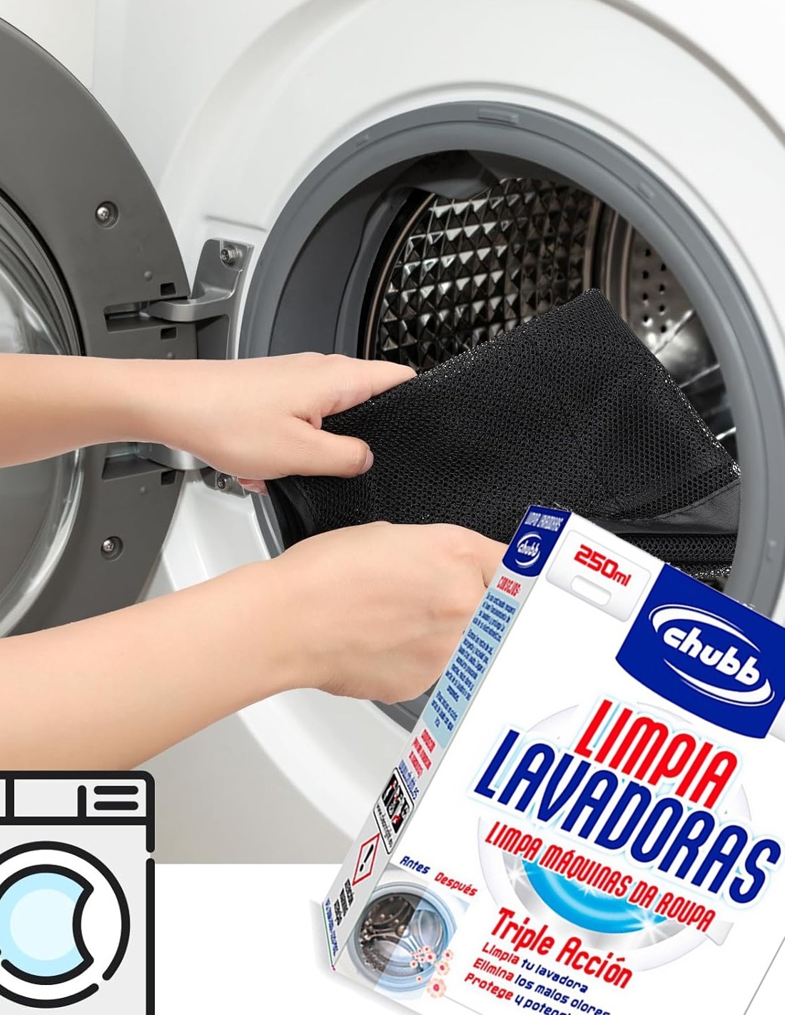 Chubb Limpia Lavadoras Triple Acción 250 ml es el aliado perfecto para mantener tu lavadora en óptimas condiciones. Limpia a fondo el interior de la lavadora, eliminando eficazmente restos de detergente, suciedad y depósitos de cal que se acumulan tras los lavados.