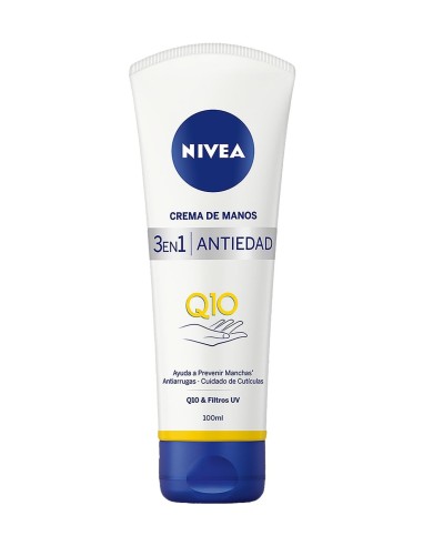 Crema de manos Nivea Q10 Antiedad 3 en 1. Hidratación, firmeza y protección contra el envejecimiento en un formato de 100ml.