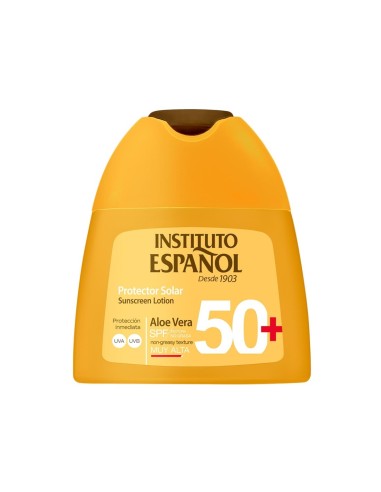 Loción solar Instituto SPF50+ con aloe vera en formato 100 ml. Protección muy alta frente al sol con efecto calmante y textura ligera.