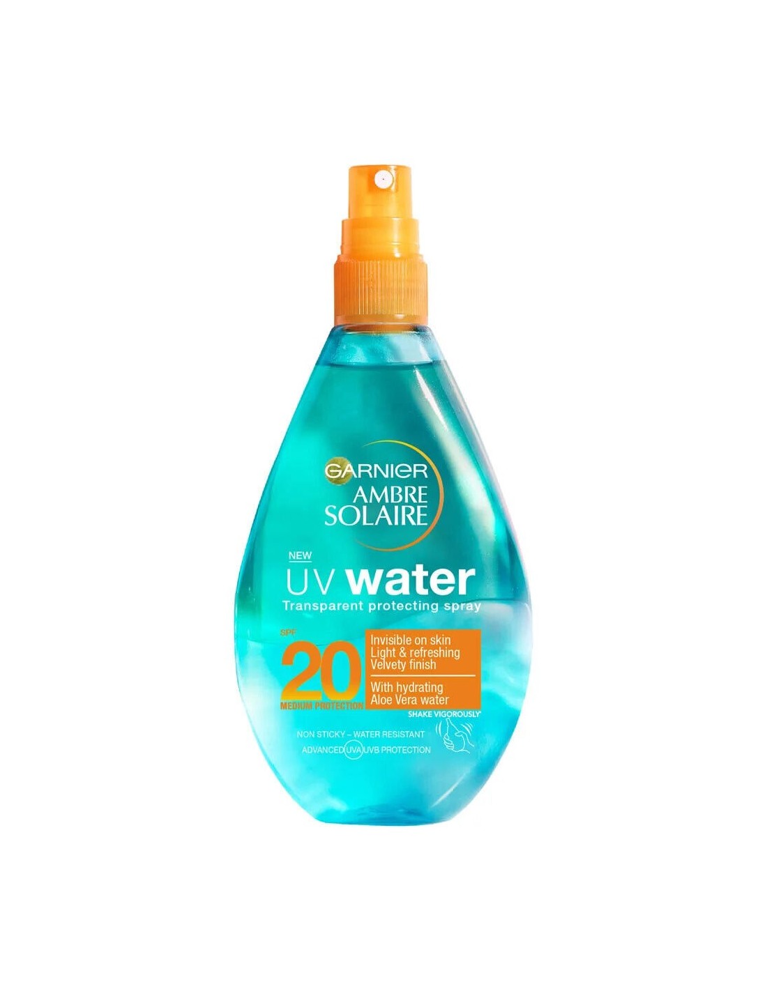 La agua protectora Garnier Ambre Solaire UV tiene una fórmula bifásica que protege al instante la piel de los daños causados por los rayos UVB y UVA y refresca la piel con una textura fresca, similar al agua, no pegajosa. Enriquecida con agua de aloe vera, la fórmula hidrata la piel y deja un acabado aterciopelado e invisible. Protección ligera y refrescante como el agua.