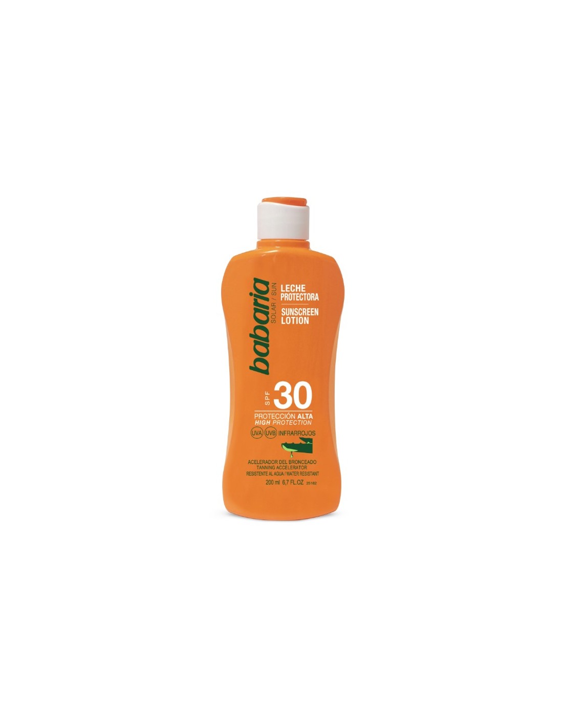 Leche protectora solar SPF30 con Aloe Vera. Protección UVA (causantes del envejecimiento prematuro de la piel), UVB e Infrarrojos.