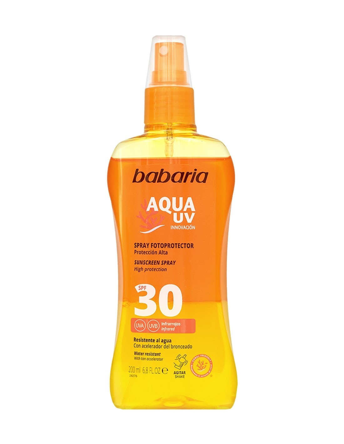 Babaria Solar Spray Fotoprotector Bifásico SPF30 Aqua UV 200 ml. Protección solar media y tacto seco.