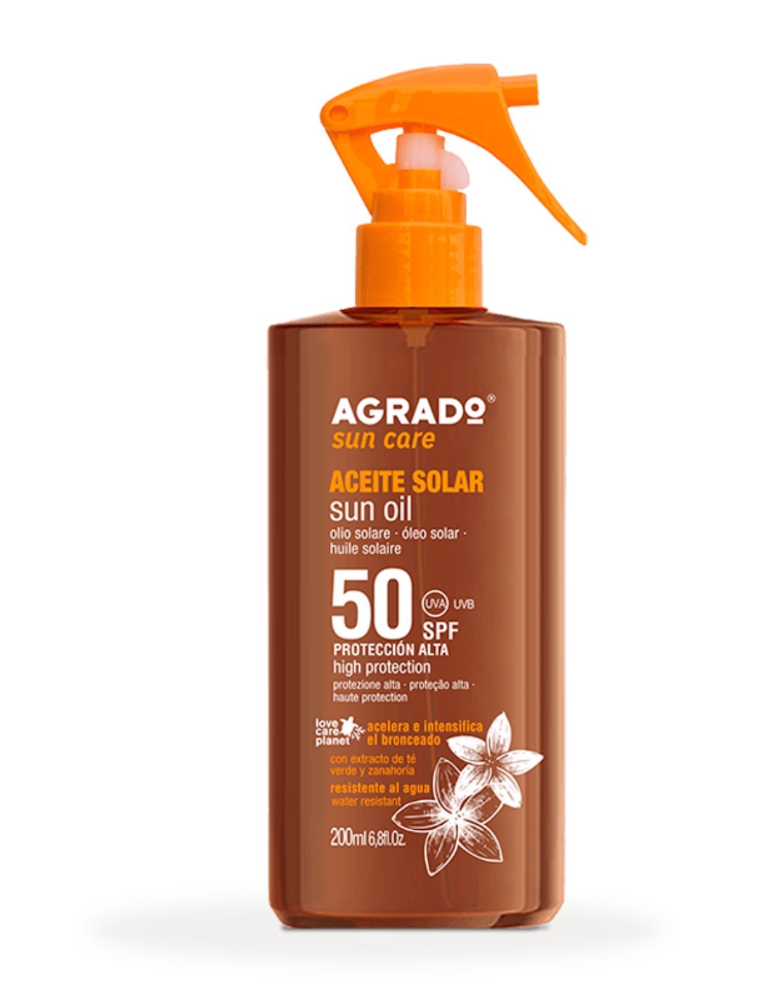 AGRADO Aceite Solar SPF50 con té verde y zanahoria. Bronceado intensificado y protección alta. Tacto seco, invisible y resistente al agua.
