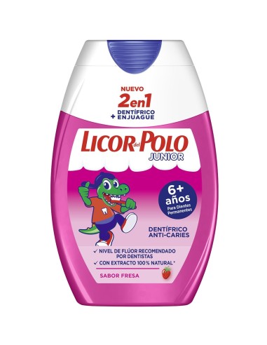 Licor del Polo 2 en 1 Junior Fresa, 75 ml. Cuidado bucal suave y divertido para niños.