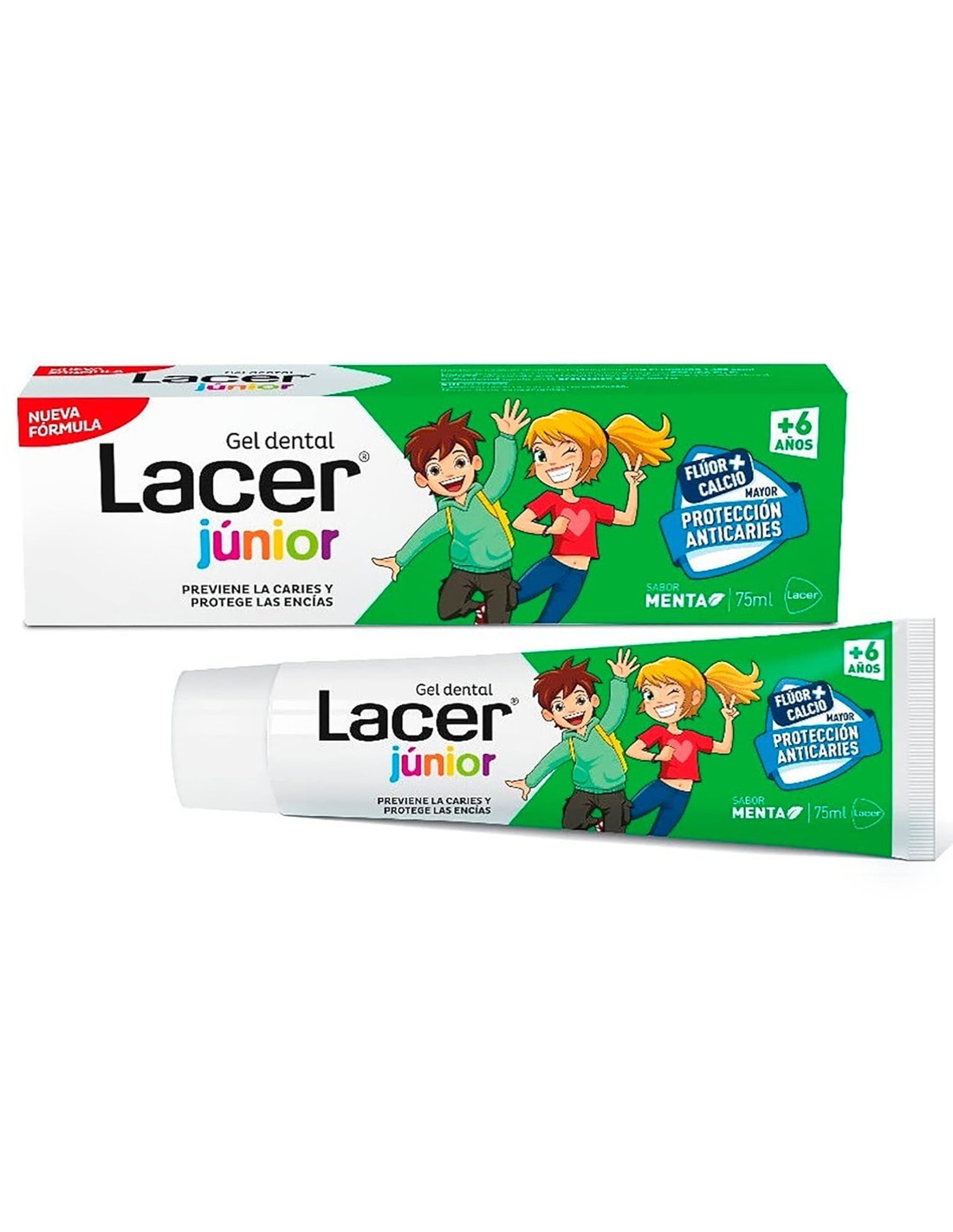 Gel dentífrico Lacer Junior con flúor y suave sabor a menta. Protege el esmalte y previene la caries en niños a partir de los 6 años.