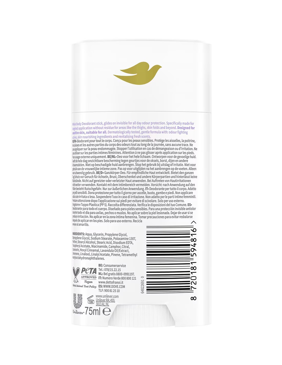 Experimenta una protección duradera y una sensación de frescura con el Dove Desodorante Stick Unisex Lavanda 75 ml. Diseñado para ofrecer una protección eficaz durante 48 horas contra el sudor y el olor, este desodorante en formato stick es adecuado tanto para hombres como para mujeres. Su fórmula, enriquecida con ¼ de crema hidratante, cuida la delicada piel de las axilas, ayudando a reducir la irritación y dejándolas suaves y lisas.