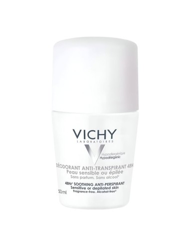 Desodorante Vichy roll-on sin perfume para piel sensible. Protege 48h sin irritar ni dejar marcas. Apto tras la depilación.