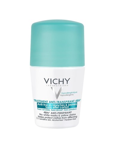 Vichy Desodorante Roll-On 48H Anti-Manchas 50 ml. Protección eficaz sin marcas en ropa clara u oscura. Fórmula hipoalergénica, sin alcohol ni parabenos.