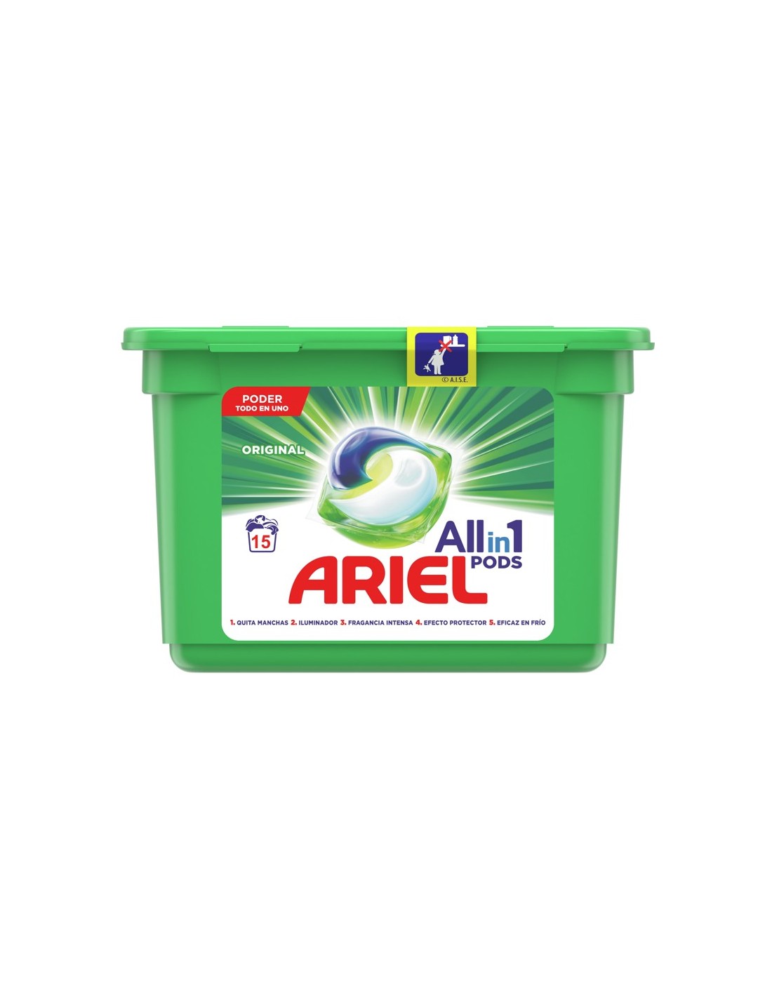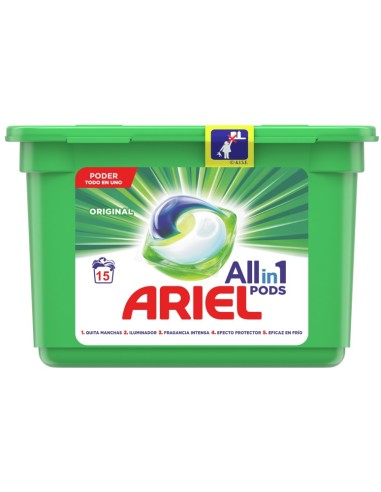 Ariel Detergente Cápsulas Original 18 lavados. Limpieza profunda, eficacia antimanchas y frescor duradero en cada colada. Práctico y sin dosificación.