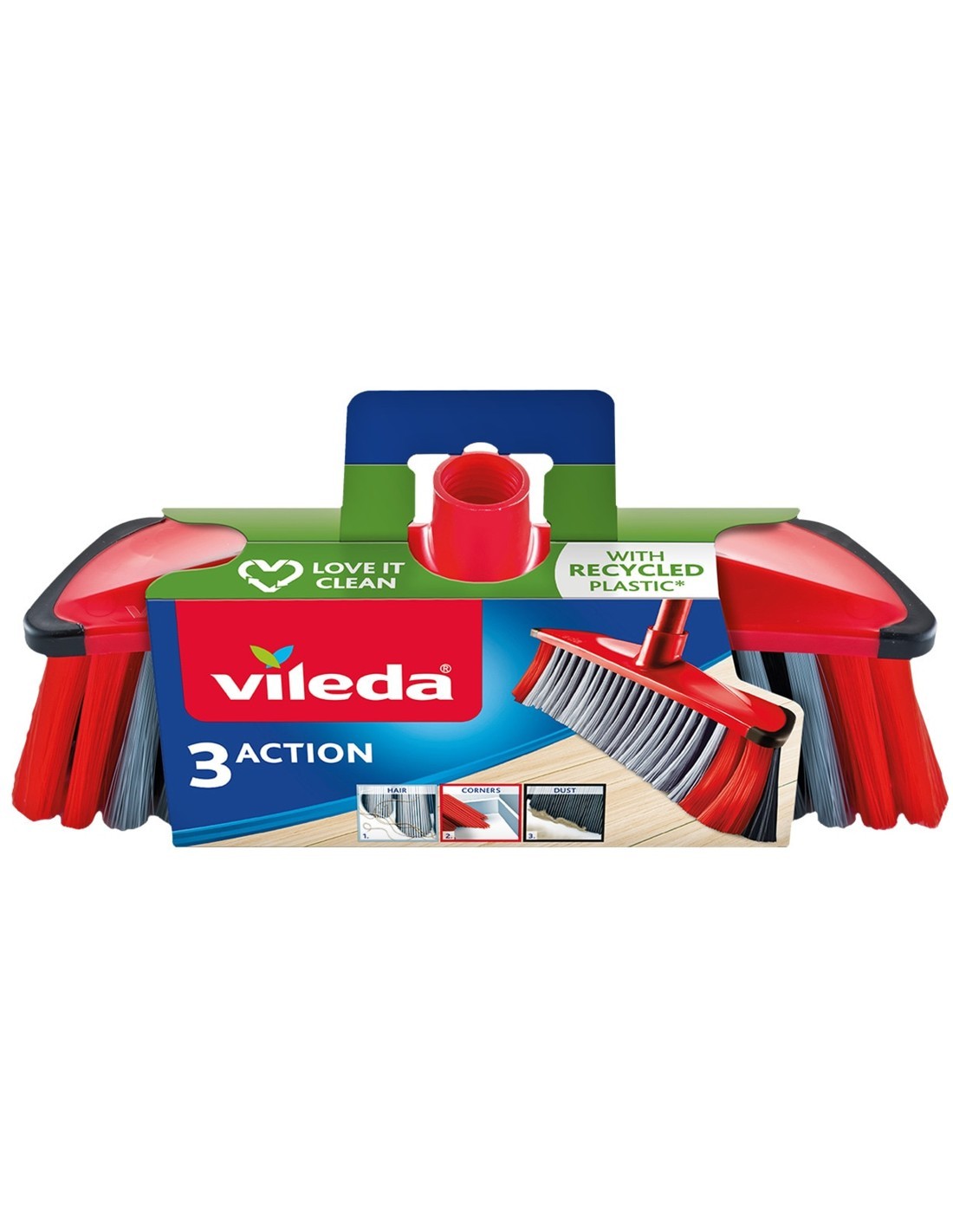 Escoba Vileda 3 Action sin palo, con triple acción de limpieza: recoge polvo, pelos y partículas. Ideal para suelos duros.