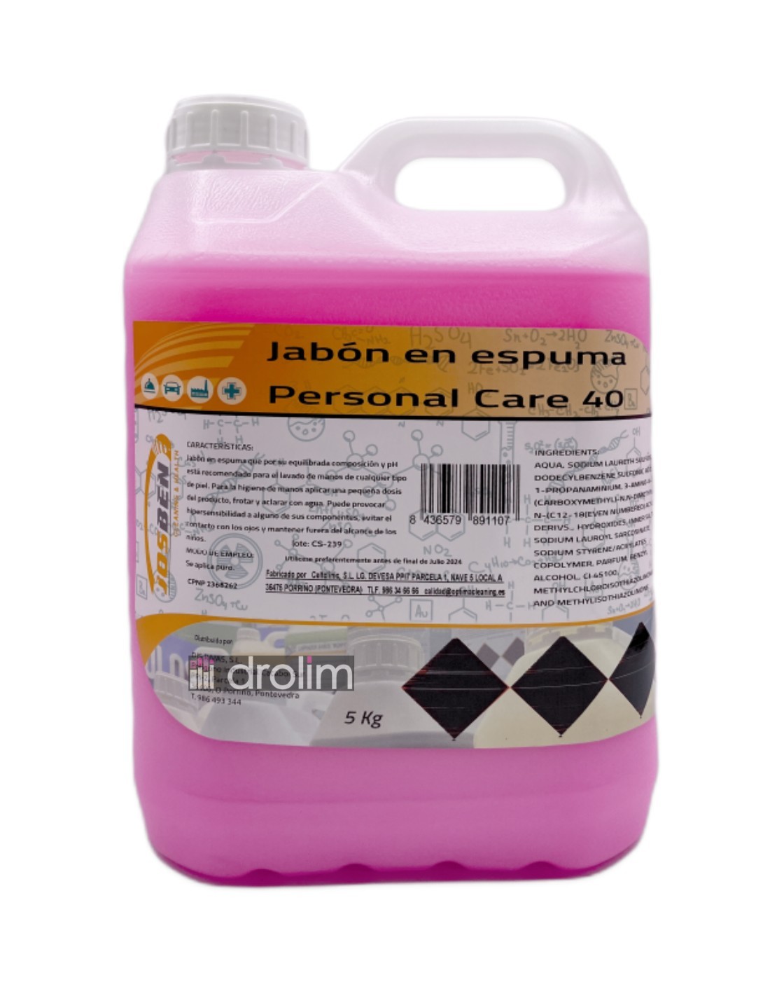 Jabón de manos en espuma Josben Personal Care 40 en formato ahorro de 5 litros. Diseñado para ofrecer una limpieza eficaz y delicada en cada uso, es ideal para entornos con alto tránsito como oficinas, centros educativos, clínicas o instalaciones públicas.