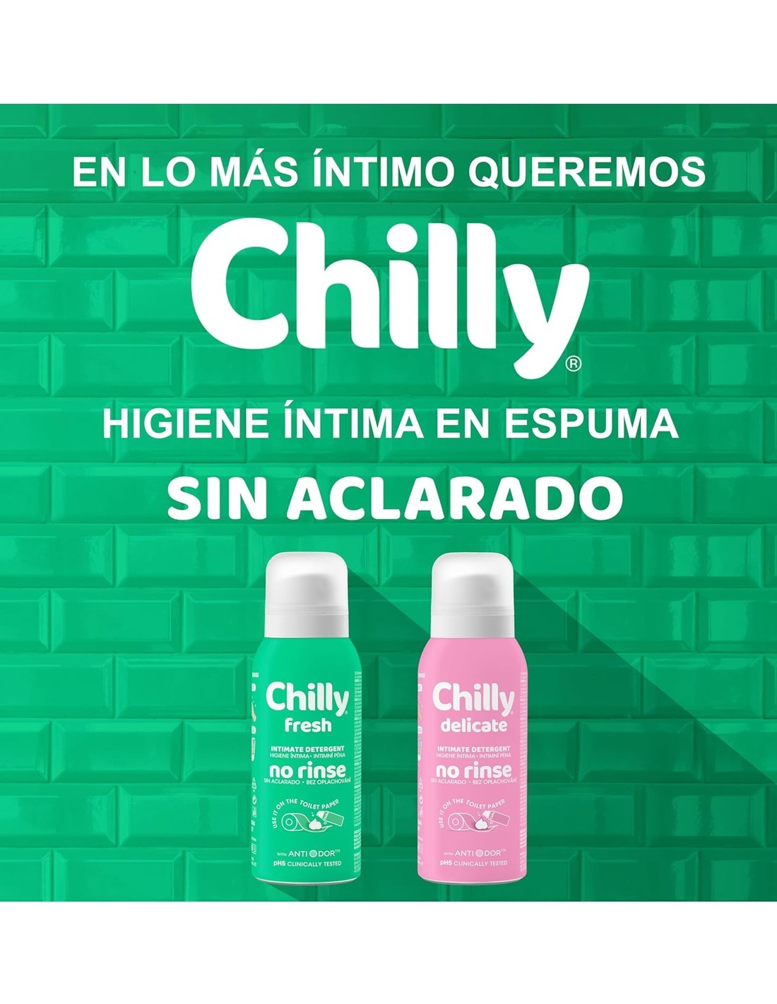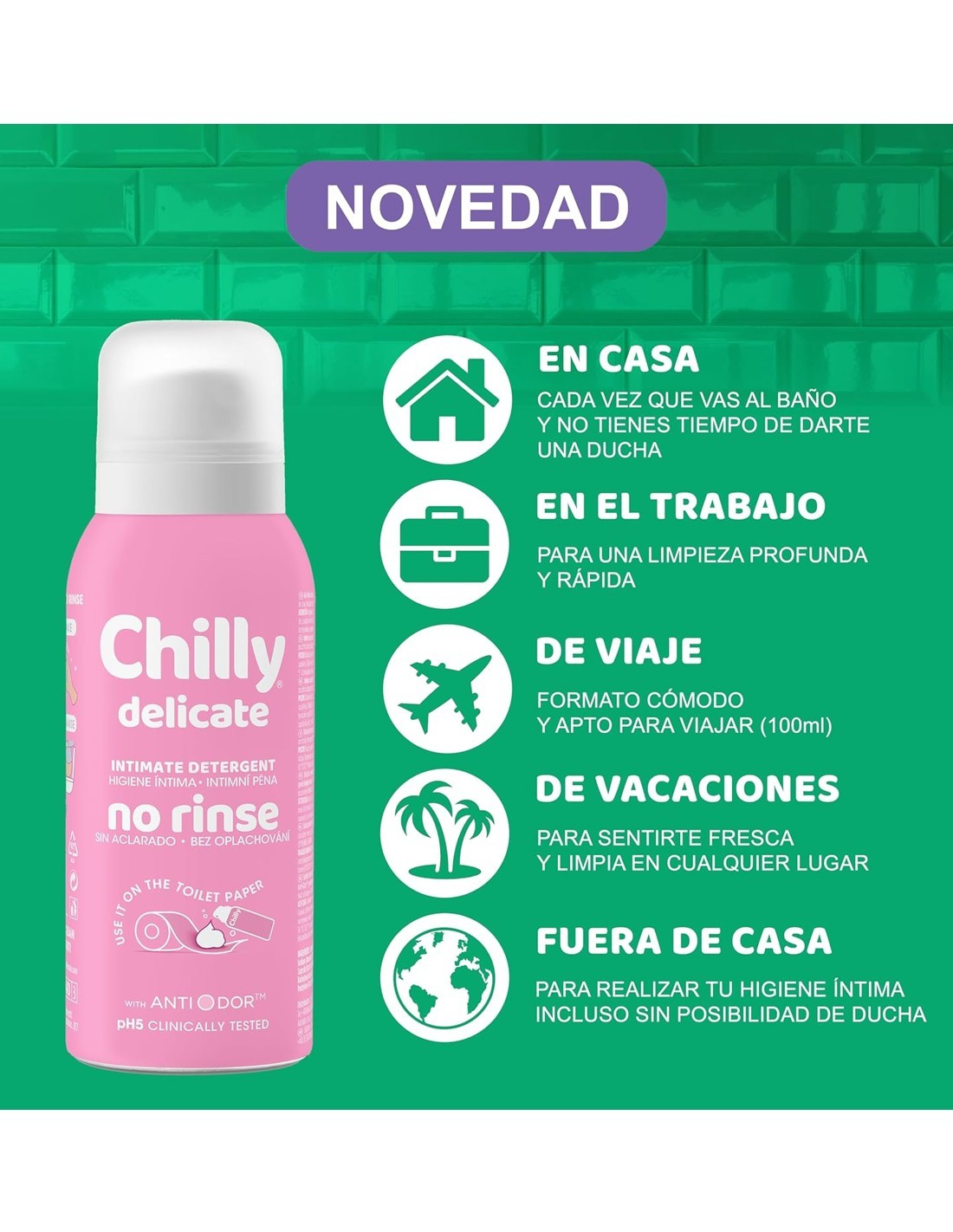 Espuma íntima sin aclarado Chilly Delicado, ideal para higiene rápida y frescura duradera en cualquier momento.