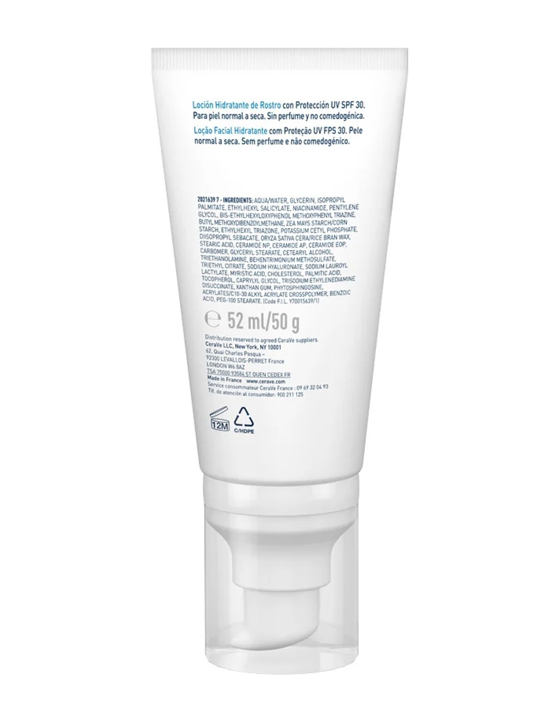 Protege y nutre tu rostro a diario con la CeraVe Loción Hidratante Facial SPF 30. Desarrollada por dermatólogos, esta loción combina la hidratación esencial con una eficaz protección solar de amplio espectro (SPF 30) contra los rayos UVA y UVB. Es perfecta para el cuidado de la piel normal a seca.