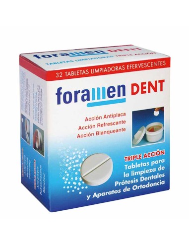 Foramen Pastillas para Prótesis Dentales son la solución perfecta para una higiene completa de tu dentadura postiza, puentes o aparatos de ortodoncia. Su potente acción efervescente limpia en profundidad, eliminando eficazmente la placa bacteriana y las manchas más resistentes. Cada envase contiene 32 tabletas, diseñadas para proporcionar una limpieza diaria que previene la formación de sarro y neutraliza los malos olores.