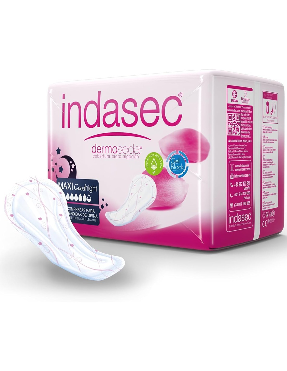 Las compresas Indasec Maxi Noche Dermoseda ofrecen una protección superior durante la noche o en momentos de mayor necesidad. Diseñadas para pérdidas moderadas de orina, estas compresas cuentan con un núcleo absorbente de alta capacidad que retiene el líquido y controla el olor de forma eficaz.